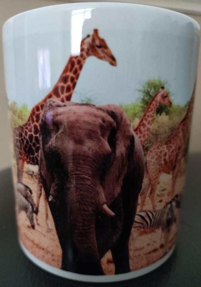 Add a splash of color to your morning coffee or tea ritual! This ceramic white mug has a beautiful photographic design, which is bound to spice up your mug tree. The photographic image is a of animals at the Waterhole captured by Hazel Wright Photography
