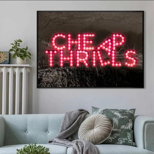 Striking graphic print on thick, 250gsm archival art paper. This beautiful photographic print depicts a the slogan "CHEAP THRILLS" set over a dark ocean background. Insert some of the neon trend into your home with our range of neon poster artwork.